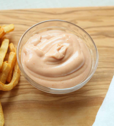 Salsa tipo mayo-ketchup: Mezcla cremosa y dulce de mayonesa y salsa de tomate (ketchup), usada comúnmente como aderezo para hamburguesas, papas fritas y otros platillos. Su sabor es suave, ligeramente dulce y muy versátil.